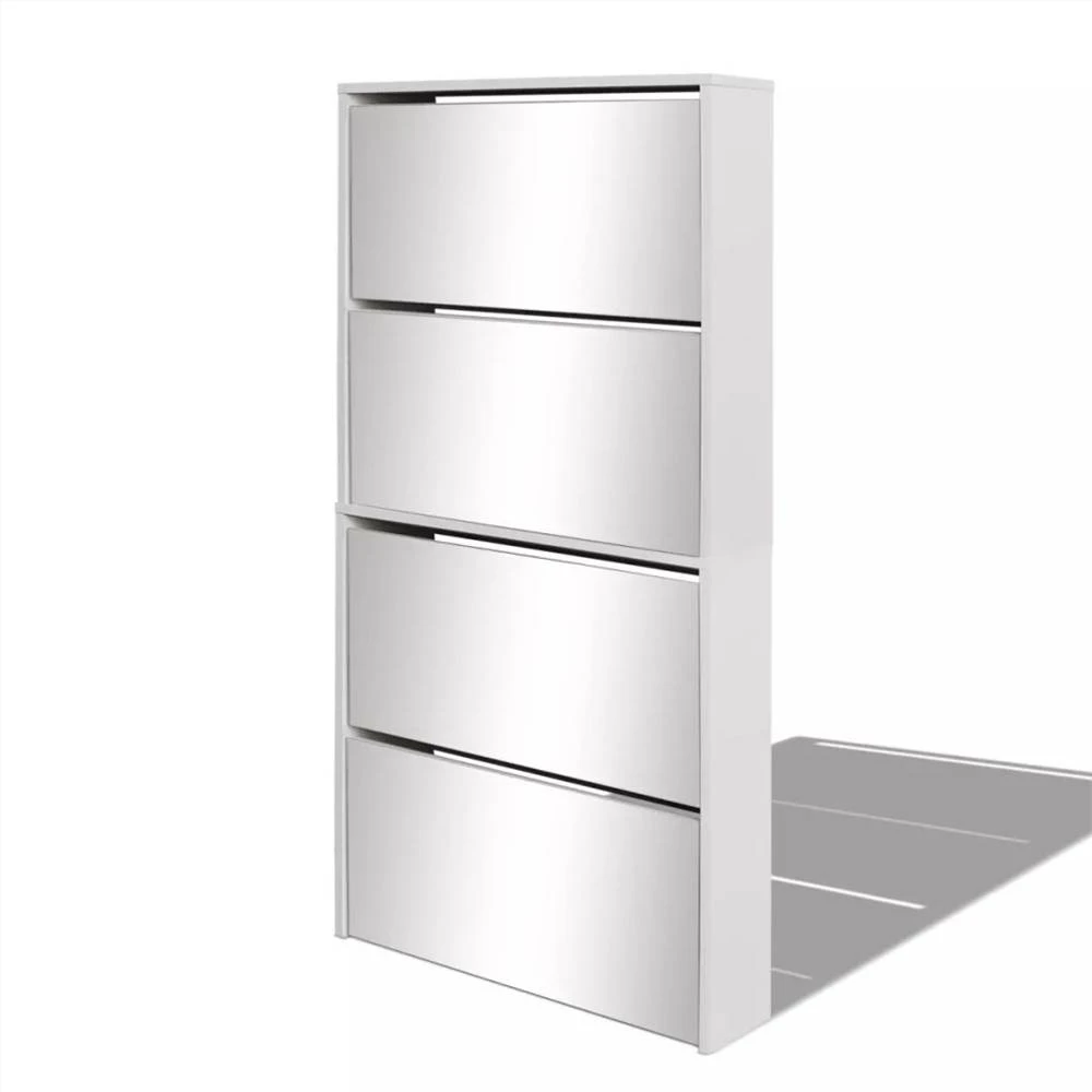 This modern, stylish mirrored shoe cabinet provides a perfect solution of keeping your room out of shoe clutter. The mirrored shoe organiser has four pull-down drawers, each of which can accommodate 3 to 4 pairs of shoes. The shoe rack is mounted directly to the wall. This strong and durable hall cabinet is made of high-quality material, making a highly practical place for neatly storing your shoes in style and clutter-free.