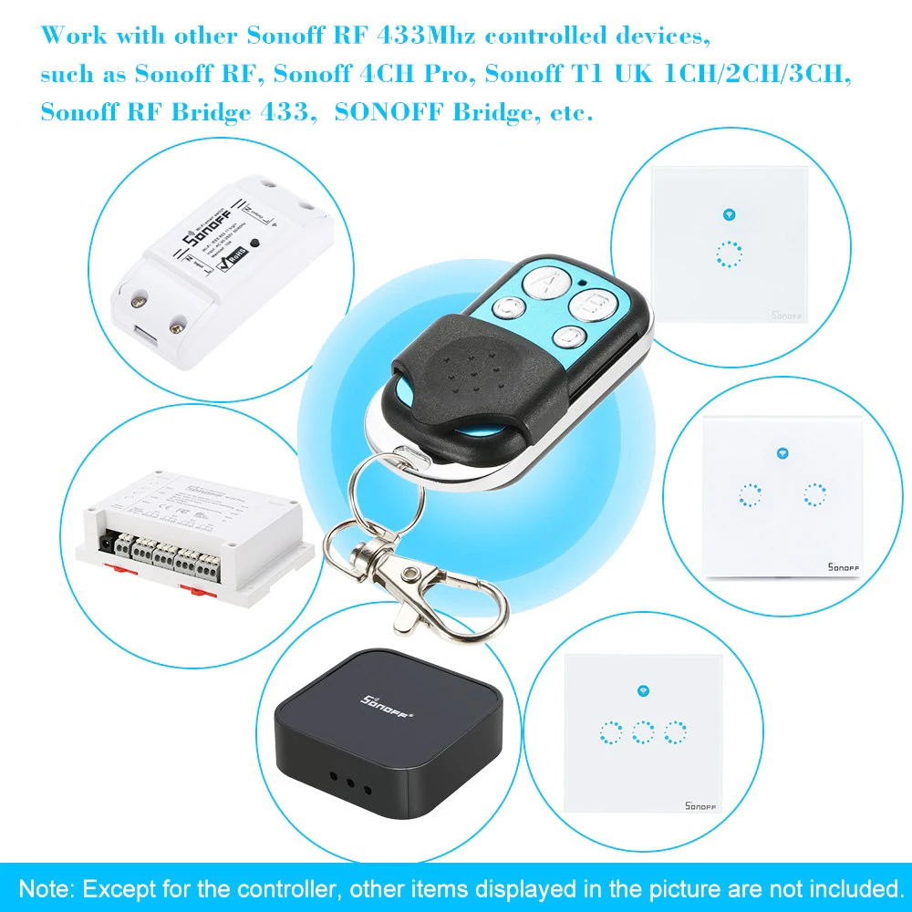 Work with other Sonoff RF 433Mhz controlled devices, such as Sonoff RF, Sonoff 4CH Pro, Sonoff T1 UK 1CH/2CH/3CH, Sonoff RF Bridge 433, etc.