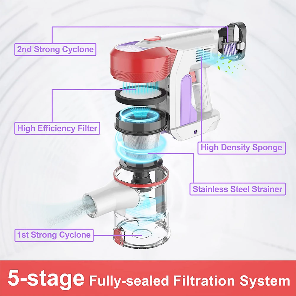 The cordless vacuum provides max 23KPa suction to pick up pet hair & dust up to 0.1 microns from hard floor and low-pile carpet. Offers up to 50 minutes cleaning time(in the lowest suction mode: 7kpa)