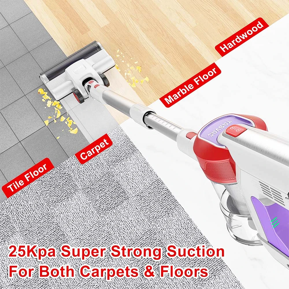 Note: TASVAC S8 cordless vacuum works on the hardwood floor and low pile carpet but is not perfect for med-pile carpet and surface with water.