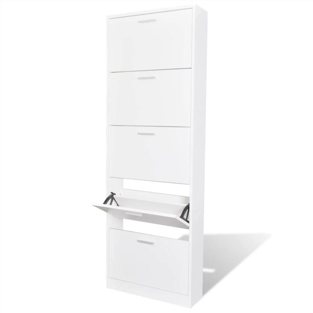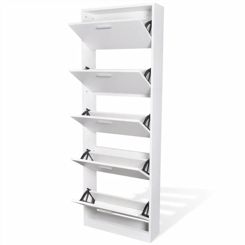 This wooden shoe cabinet has 5 storage compartments and a simple, yet stylish design. You will no longer be annoyed by shoes cluttering your floor. Up to 15 pairs of shoes can be stored dust-free in the 5 compartments. Made of high quality wood, our shoe cabinet is easy to assemble.