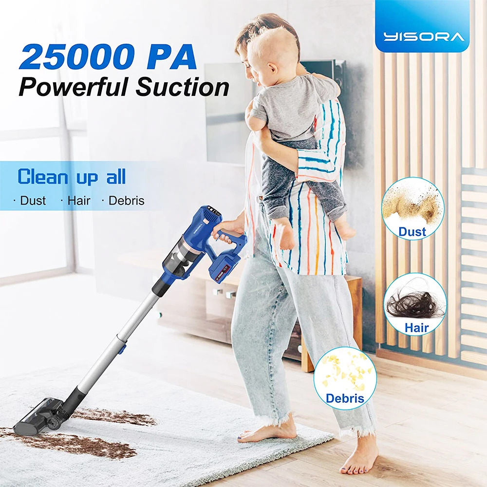 The LED display on the vacuum cleaner wirelessly shows status information for battery and mode. If roller brush or filter is clogged, the signal lamp will light up. In addition, the battery vacuum cleaner has overvoltage, overheating, short circuit protection. If you have any questions, please feel free to contact us